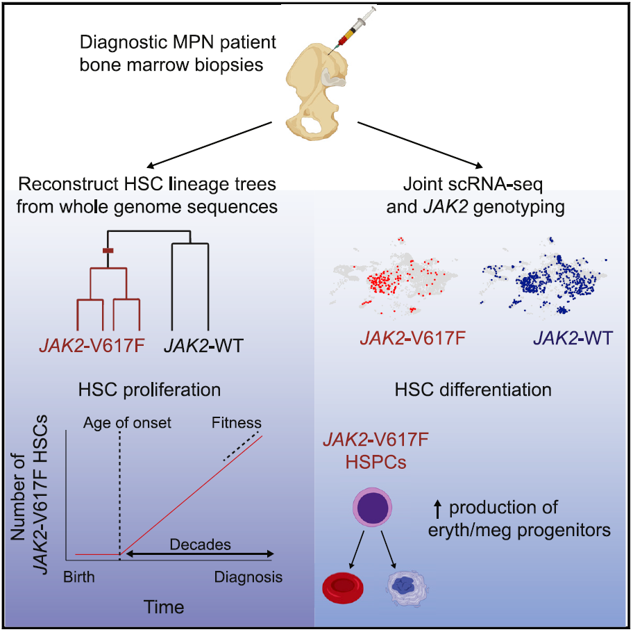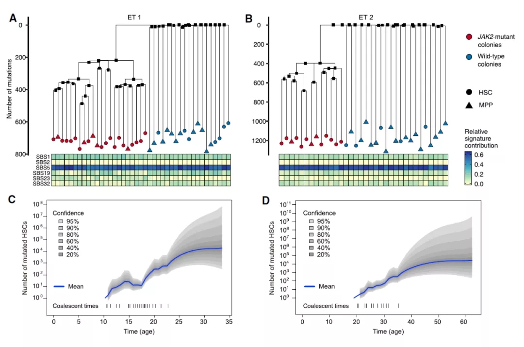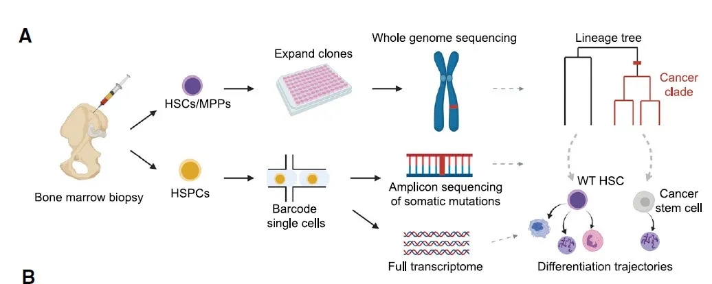 研究团队收集了2名骨髓增殖性肿瘤患者的骨髓干细胞,通过单细胞基因组测序,重建了他们的癌细胞进化史,追踪导致他们癌症的起源细胞突变时间表。